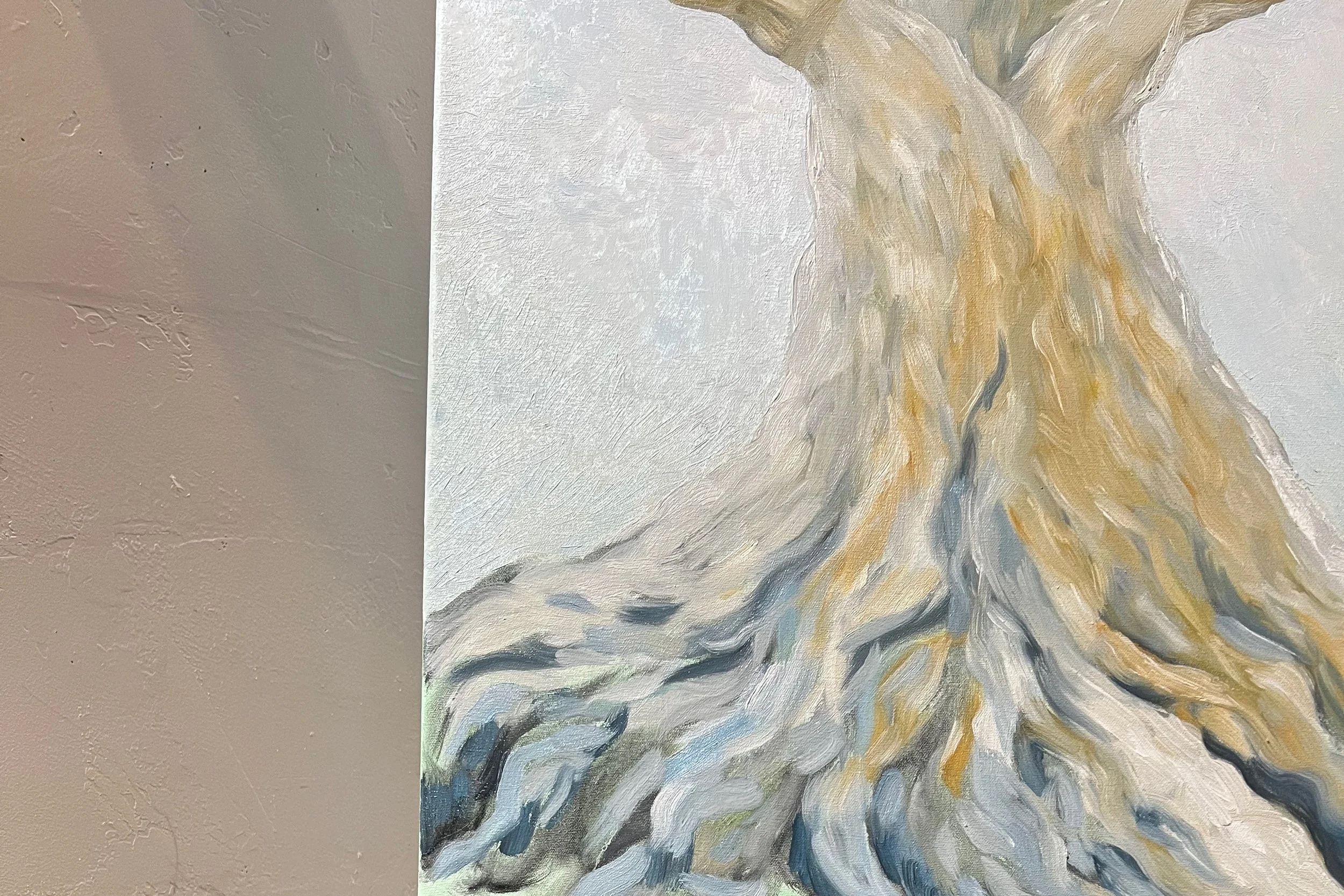 The current progress as of writing this welcome card of a blog post on a Van-Gogh-inspired giant tree. It will eventually have a tiny civilization nestled within its roots. I'm so thankful for the skylight that shines on this spot in my little studio space above the gallery at Cultivate 7Twelve.